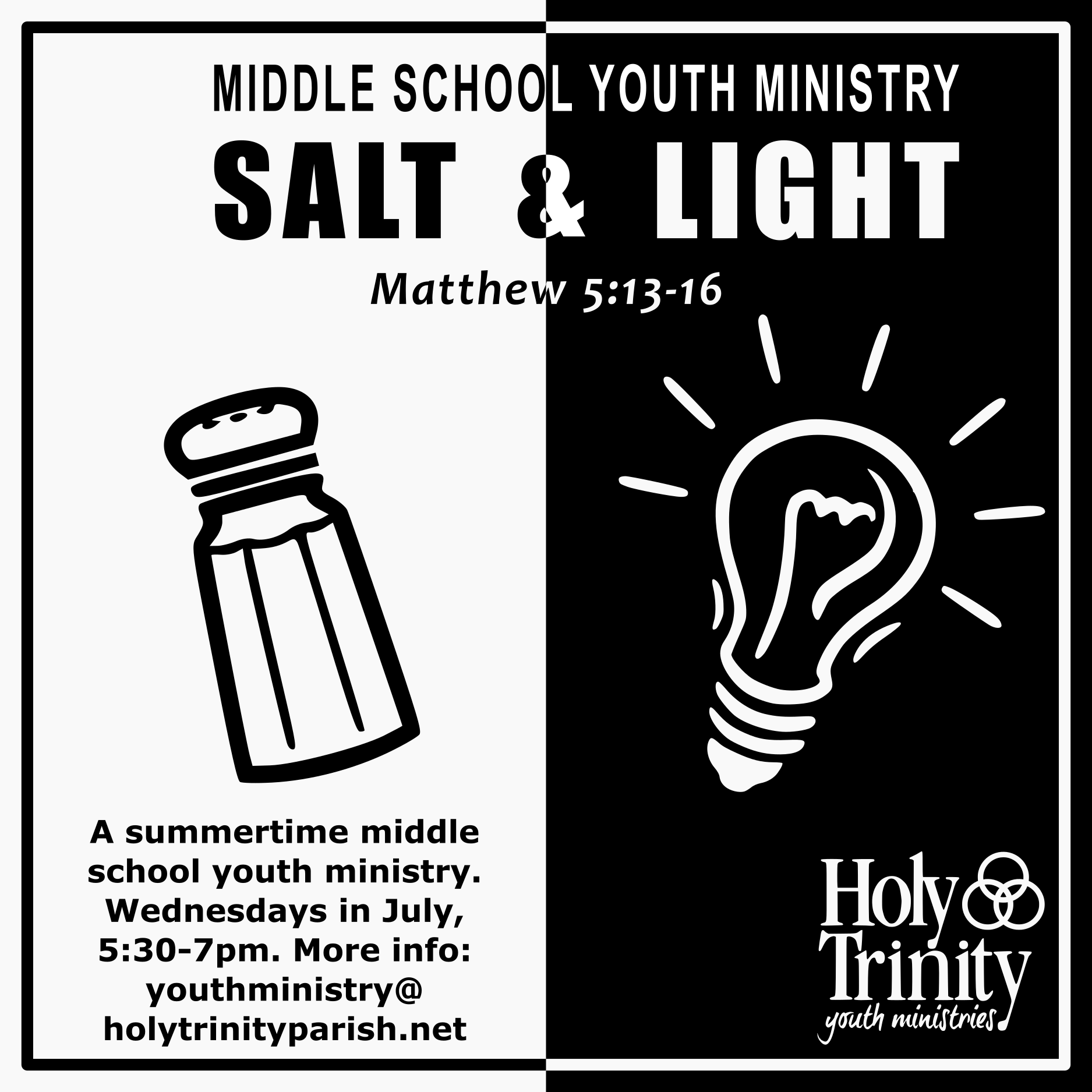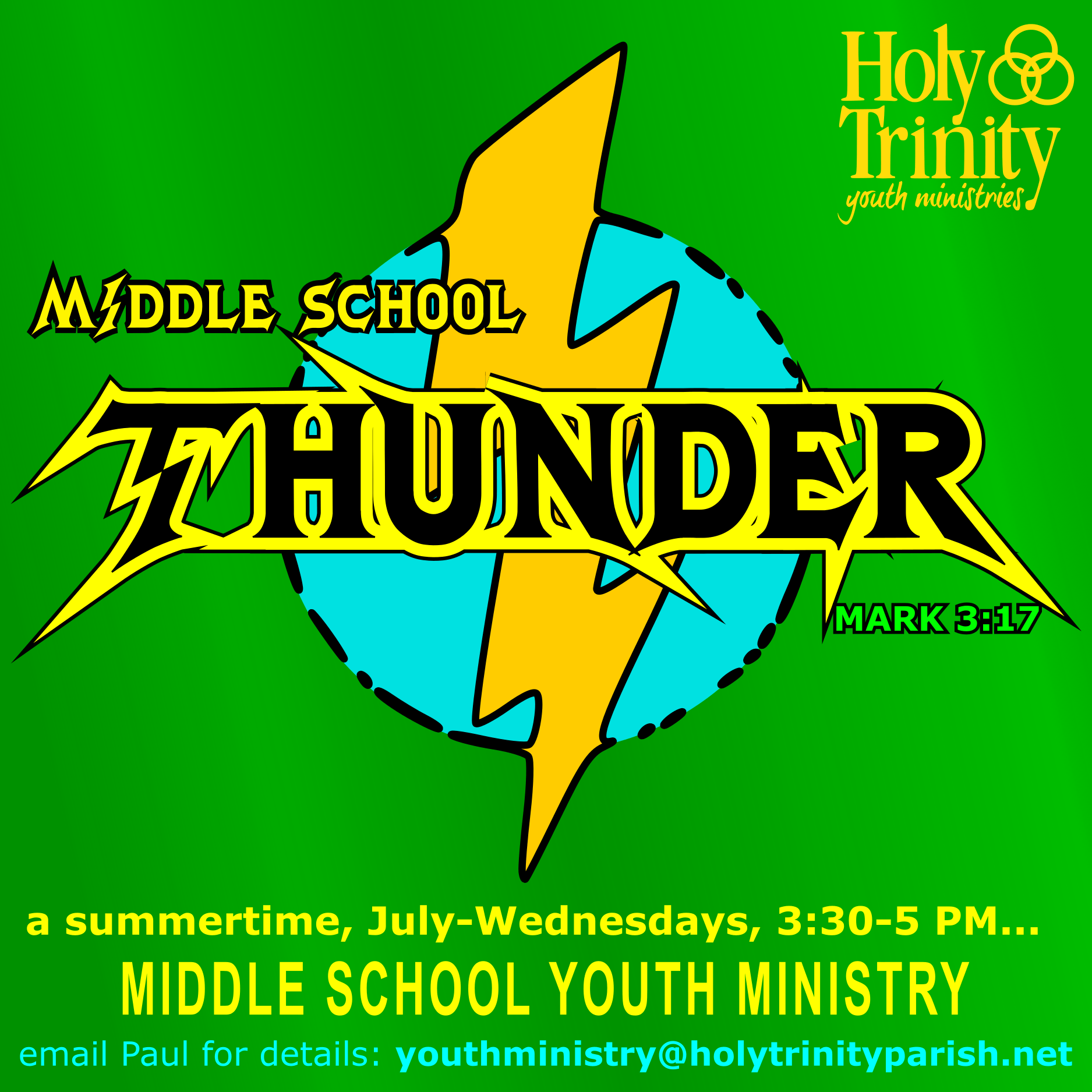 Summertime, July, middle school ministry: come for fun, faith, and time with friends and community. All middle schoolers welcomed, from those that will be in grade 6 this coming September … Continue reading "Middle school Thunder"